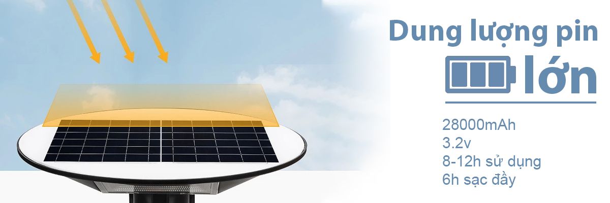 - Đèn UFO năng lượng mặt trời sở hữu dung lượng Pin Lithium Ion lên đến 3.2v 28.000mAh nên đèn nlmt có thể chiếu sáng hiệu quả trong thời gian lên đến 8-14 tiếng liên tục.