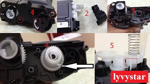 + sau khi đổ mực mới vào thì đậy nắp đổ mực lại, lắp lại bộ bánh răng , lắp ốp bánh răng rồi vệ sinh qua hộp mực cho sạch sẽ.